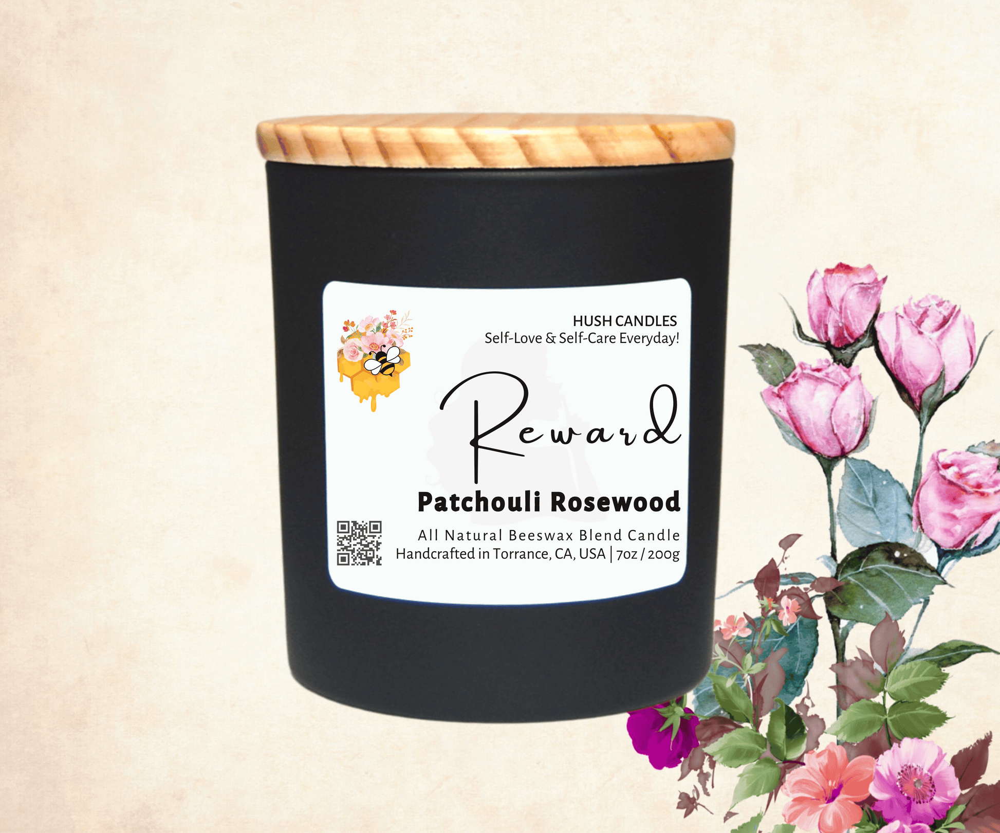 Indulge in the opulent scents of patchouli and rose, reminiscent of incense, as a luxurious reward for yourself. Enjoy the clean burn of a beeswax blend candle.